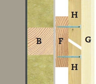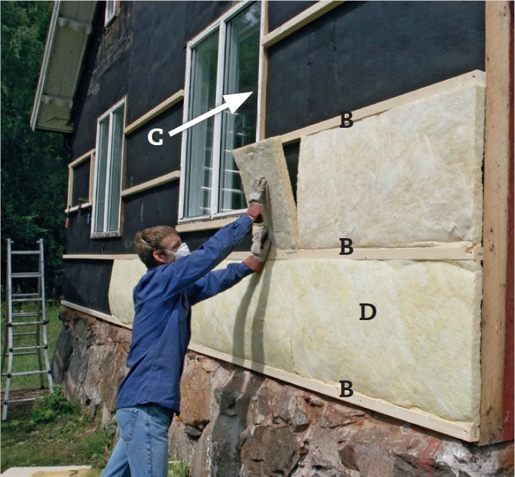 Isoleringen (D) trycks lätt på plats när de vågräta reglarna (B) har monterats och påbyggnadsreglar (C) har fästs runt fönstren. Isoleringen är 10 mm bredare än regelavståndet så den kläms fast och blir sittande.
