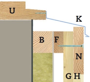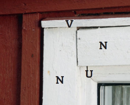 FEL 5: Foderlisten (N) ovanför fönstret har täckts av en nästan vågrät bräda (V), som nu är halvrutten. Listen tar emot vattnet och leder in det i gaveln, där det rinner på baksidan av den lodräta foderlisten (N) och in bakom karmen (U).