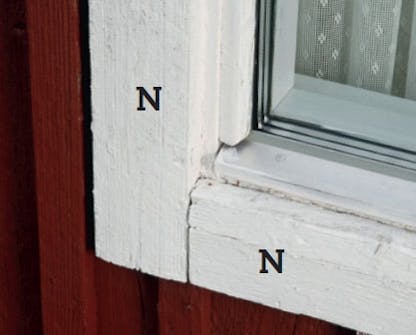 FEL 6: Fönstrens undre del bjuder regnet välkommen med ett antal fogar och springor, vilket innebär att vattnet tränger in i väggen, bland annat bakom foderlisterna (N).