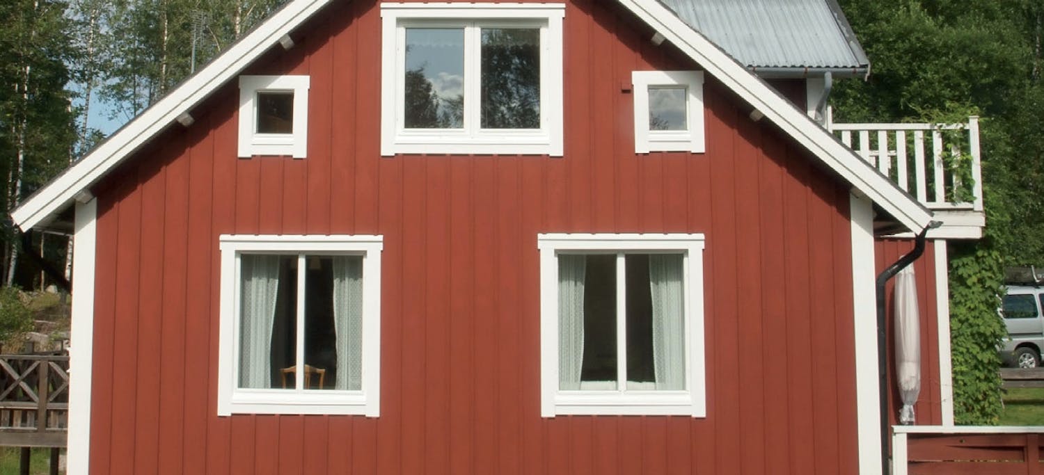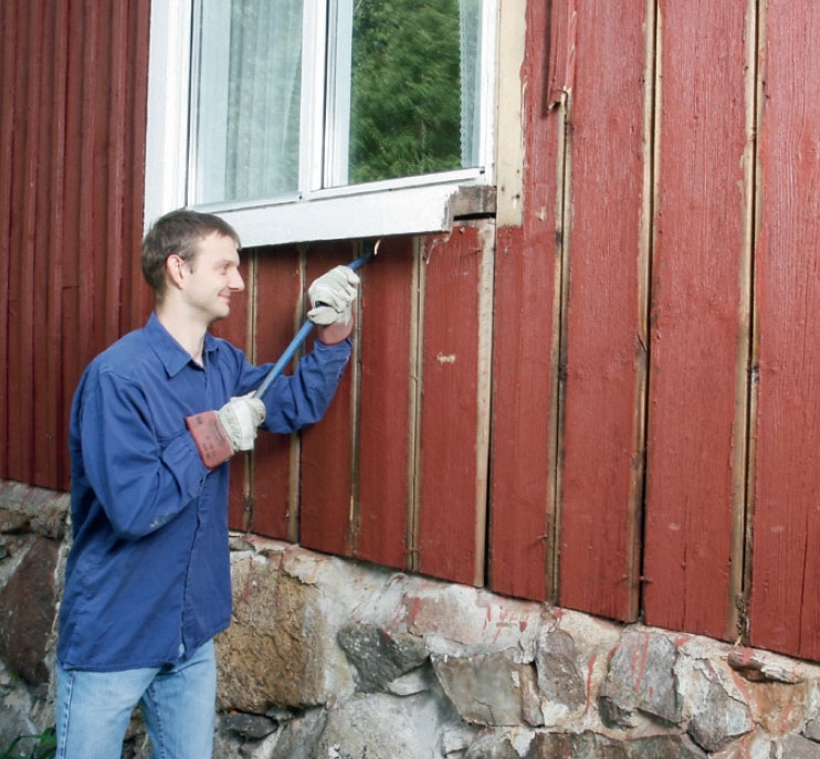 Först lossar vi och tar bort den gamla fasadpanelen och alla lister runt fönster och dörrar. Till arbetet används en kofot och en rejäl hammare. Eftersom vi sätter upp mer isolering tas allt trä bort in till fönsterkarmen, som ska byggas på.