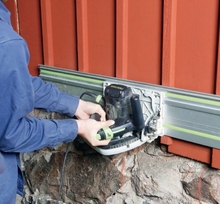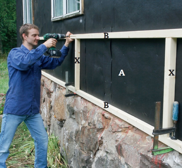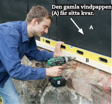 Nu bygger vi upp den stomme som den nya fasadbeklädnaden ska sitta på. Vi börjar med en vågrät regel (B) nertill. Om fasaden är ojämn ska man fästa regeln längs en lina och räta upp den med brickor så att den hamnar rakt och vågrätt.