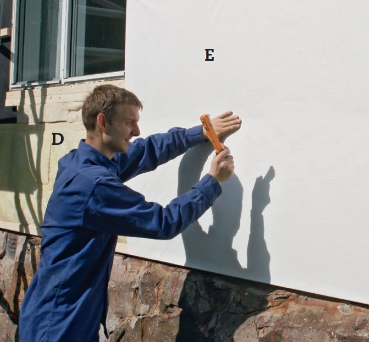 Den vindtäta pappen (E) sätts utanpå isoleringen. Den kan fästas med pappspikar eller häftklammer. Arbetet går jättesnabbt när klamrarna slås i med en häfthammare, för den sköts med ena handen medan den andra sträcker pappen.