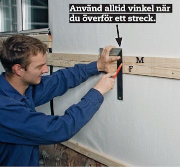 Vi markerar på distanslisterna (F) var brädorna (G) ska hamna. Det räcker att göra det på två distanslister ovanför varandra. Jobbet går snabbt för vi använder en mall (M), där vi har markerat för både brädor och locklister.