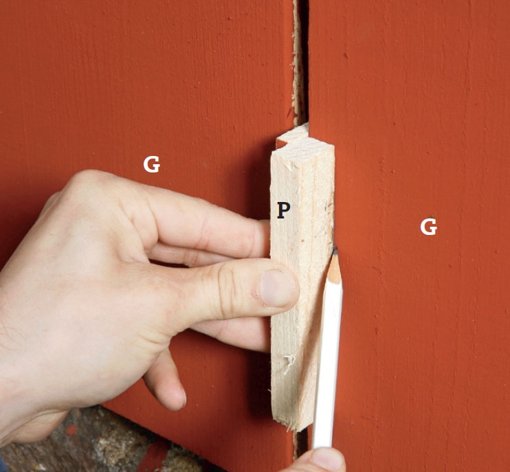 Nu markerar vi för locklisterna (H) och till det använder vi en mall av två lister. Den ena är så smal att den precis kan tryckas in mellan brädorna (G) och den andra (P) sitter fast på den inre så att kanten på den anger var locklisten ska sitta.