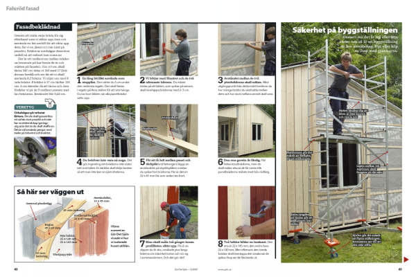 Det är ett mellanrum mellan brädorna beroende på hur breda de är och måtten på fasaden. Om vi t.ex. skall täcka 140 cm delar vi 140 med 17 (brädornas bredd) och ser då att vi skall använda 8,2 brädor. Vi nöjer oss med 8 hela brädor. 8 brädor à 17 cm täcker 136 cm. 4 cm återstår då att täcka och dem fördelar vi på de 9 mellanrummen mellan brädorna. Avståndet blir 0,44 cm.