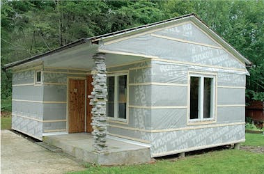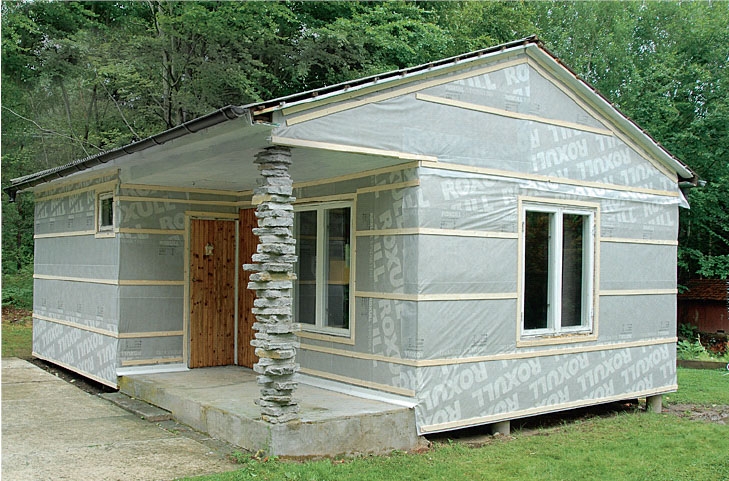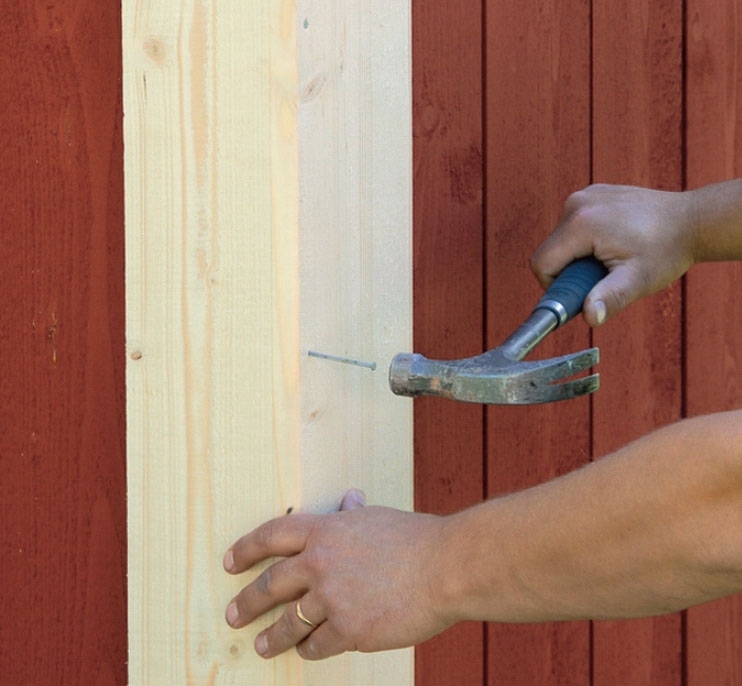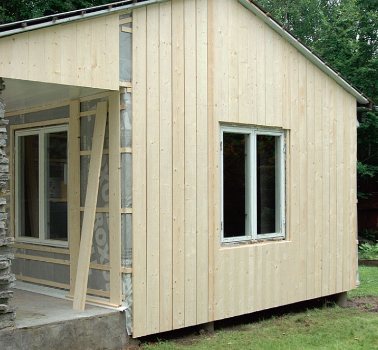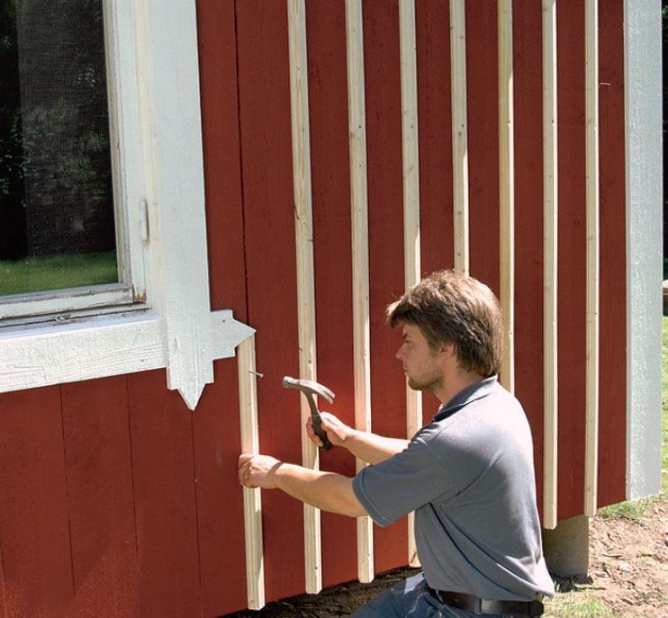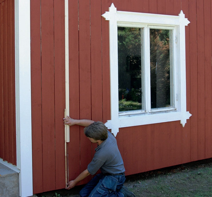Vi börjar med fönstret och de två närmaste hörnen. Du måste tänka på att läkten, som spikas på senare, skall överlappa brädorna med 2-3 cm.