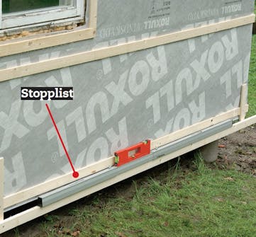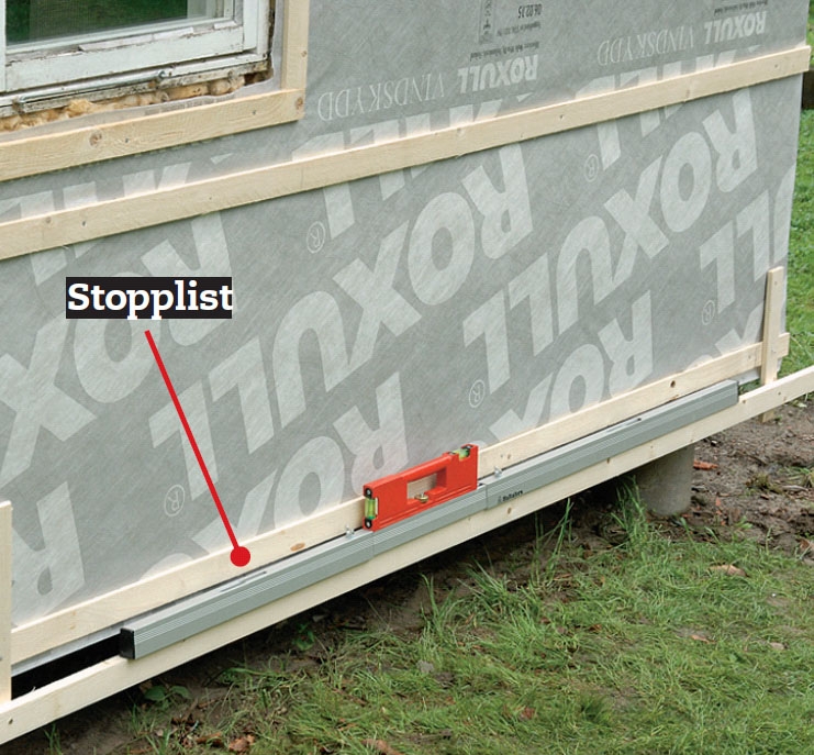 En lång bit läkt används som stopplist. Den sätter du 5 cm under den nedersta regeln. Den skall fästas i regeln på flera ställen för att inte hänga. Du tar bort läkten när alla panelbrädor satts upp.