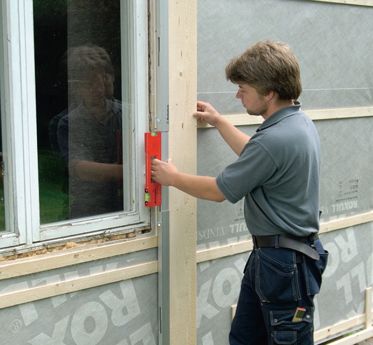 Genom att lägga vattenpasset eller en bräda intill fönsterhörnet kan du mäta den bredd salningen, dvs. ramen mot fönsterkarmen, skall ha. Mät i alla fyra hörnen för säkerhets skull.