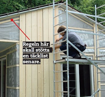När vi sågade till brädorna till panelen på huset var vi inte så noga. Vi kommer nämligen att dölja övre kanten på panelbrädorna med en målad list (22 x 45 mm). Bakom brädorna sitter det en extra regel som vi spikade upp för att listen skulle ha något att sitta ordentligt fast i.