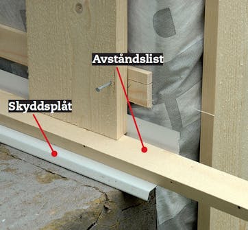 För att få luft mellan panel och täckplåt (vid betongen) läggs en avståndslist på skyddsplåten medan du spikar fast brädorna. Här är det en 22 x 45 mm list som sedan tas bort.