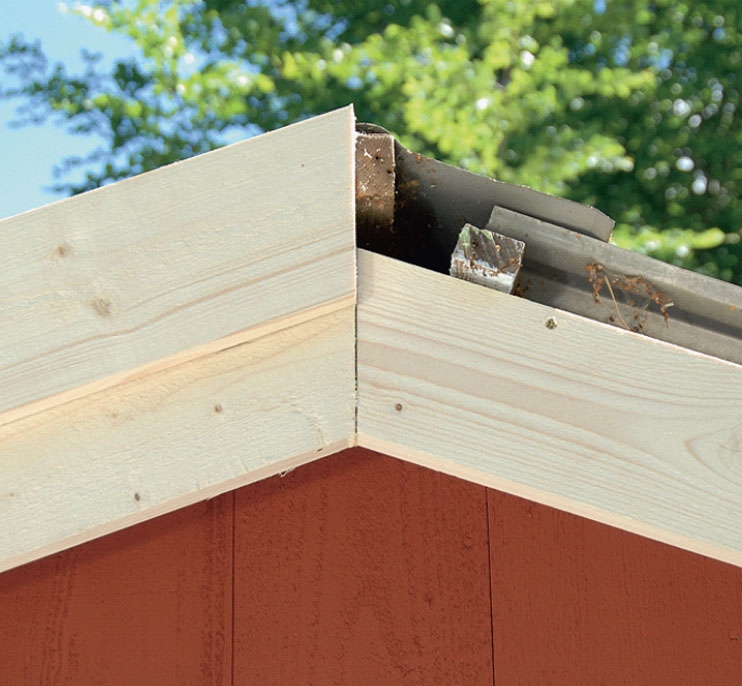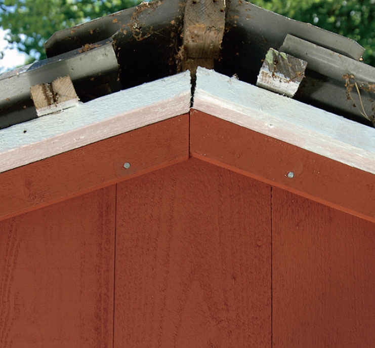 De gamla vindskivorna har försiktigt tagits ner. Nu blir det lätt att såga till fyra nya vindskivor genom att lägga de gamla ovanpå den nya och rita upp.