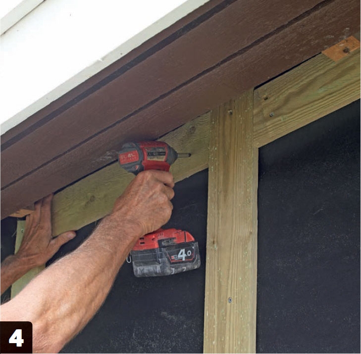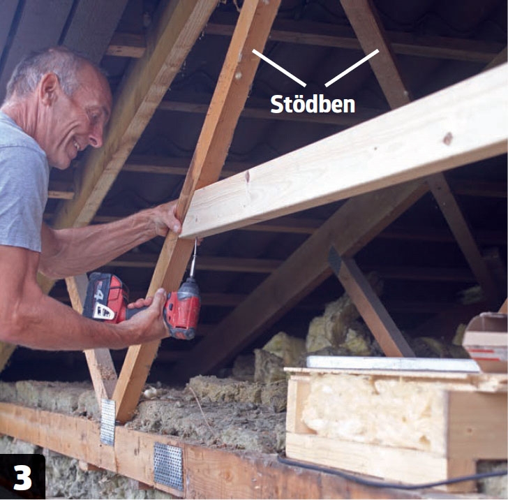 Den vågräta hanbjälken skruvas fast vid den yttersta takstolen när du har kapat den med sneda snitt i ändarna.
