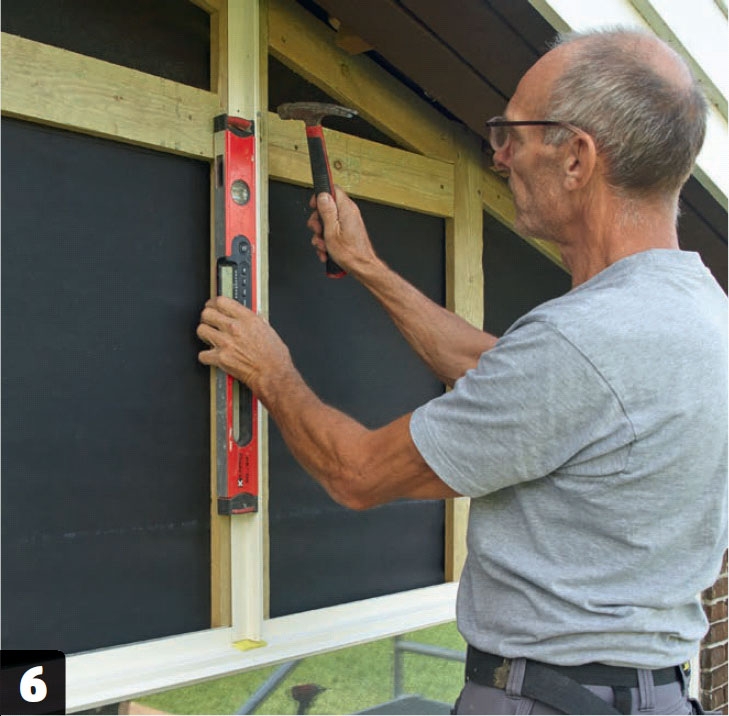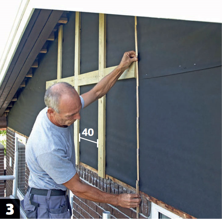 Sätt upp spikläkt till den nya gavelpanelen. Börja mitt på och arbeta dig ut mot sidorna. De lodräta läkten placeras med ett avstånd på 40 cm med en läkt mellan som fästs på hanbjälken.