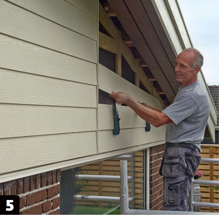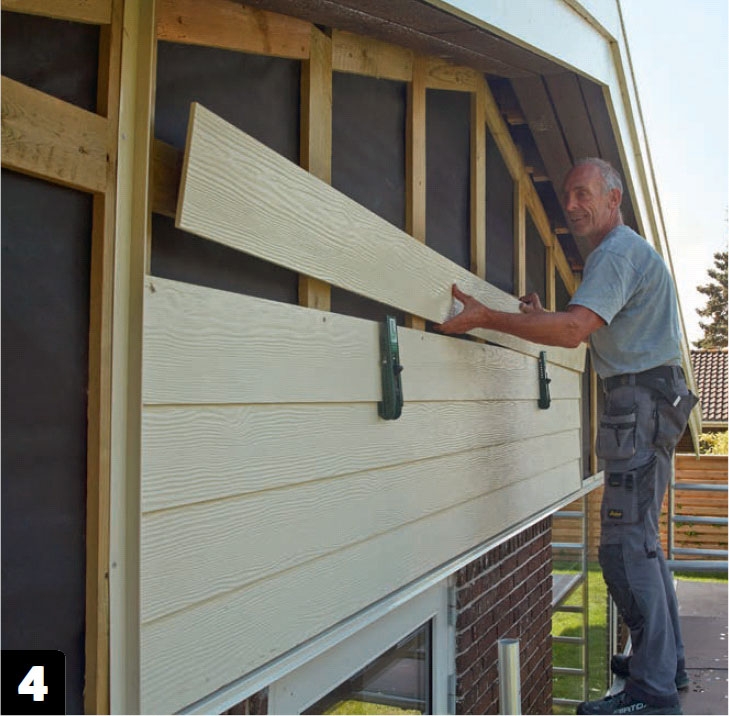Nästa bräda monteras med hjälp av en hållare. Den ser till att det är exakt 15 cm mellan brädornas underkant. Hållaren trycks upp bakom den undre brädan och låses så att nästa bräda kan läggas upp.