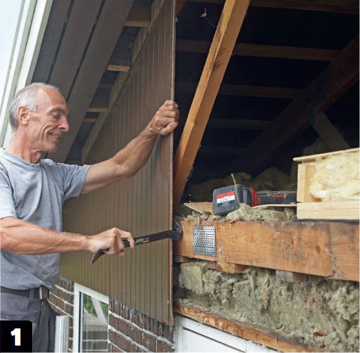 Ta bort den gamla gavelbeklädningen. Ofta är de gamla gavelbrädorna monterade direkt på de yttersta takstolarna som här eller på en förstärkning. En kofot är idealisk för uppgiften.