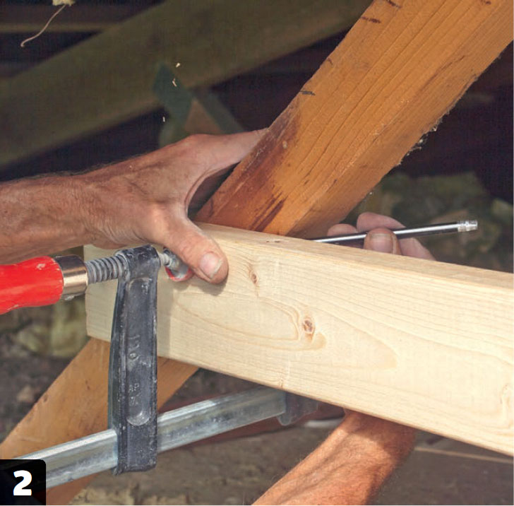 De långa skruvarna sätts i snett - en genom takstolen uppfrån och en genom hanbjälken nerifrån in i takstolen. De långa skruvarna här är 6 x 150 mm.