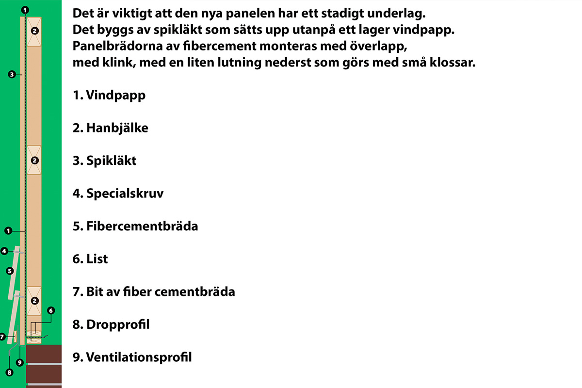 När den extra hanbjälken har satts fast kan du sätta upp vindpapp på gaveln. Utanpå sätts spikläkten upp, så att det finns ett stadigt underlag för den nya liggande gavelpanelen. “Brädorna” av fibercement kräver stöd var 40-60 cm. Här sätts den lodräta läkten med ett avstånd på 40 cm.