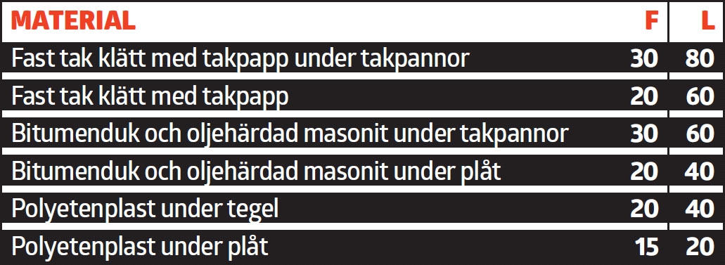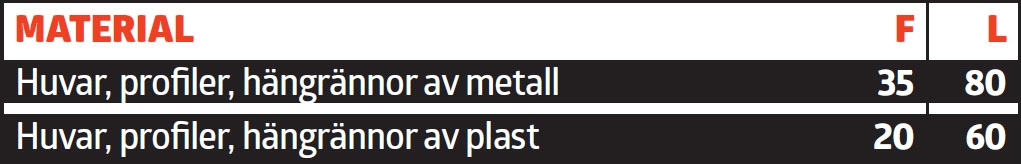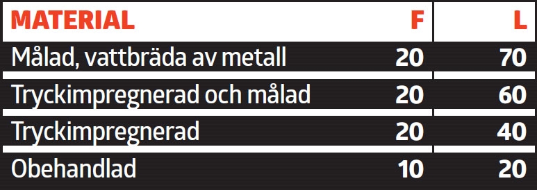 Från början har man nog tänkt att vindskivor och takfotsbrädor ska vara offerträ, alltså trä som man är beredd att byta ut ganska ofta eftersom träet sitter på utsatta ställen. Men placeringen innebär också att de skyddar andra delar av taket som är viktiga. Uppskattningarna nedan är för fyra olika varianter, men vi får inte glömma att man också kan välja kompositmaterial och fibercement, som båda har lång livslängd.