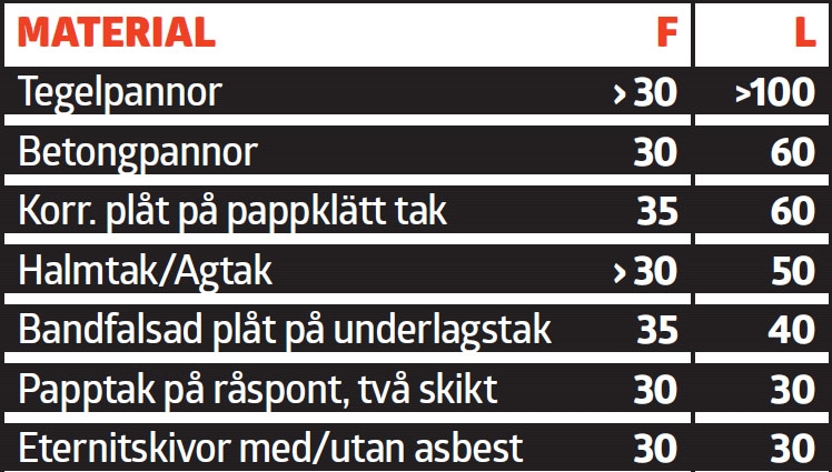 Våra försäkringsbolag använder sig däremot av en helt annan beräkning baserad på hur snabbt en byggnadsdel kan avskrivas ekonomiskt. Om försäkringsbolaget gör en uppskattning av hur länge en takbeläggning med en given taklutning kan hålla så är det bara en uppskattning som används vid bedömning av åldersavdrag efter en skada. Men för varje aktuellt fall tvingas man se på hur länge delen rent faktiskt har hållit, hur den har underhållits, hur konstruktionen ser ut och om den påverkas av väder och vind etc.