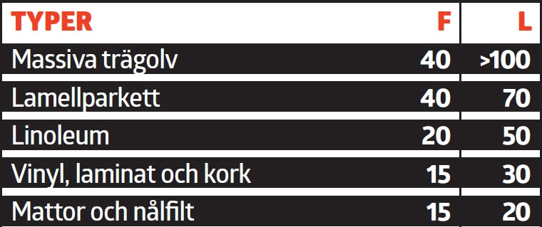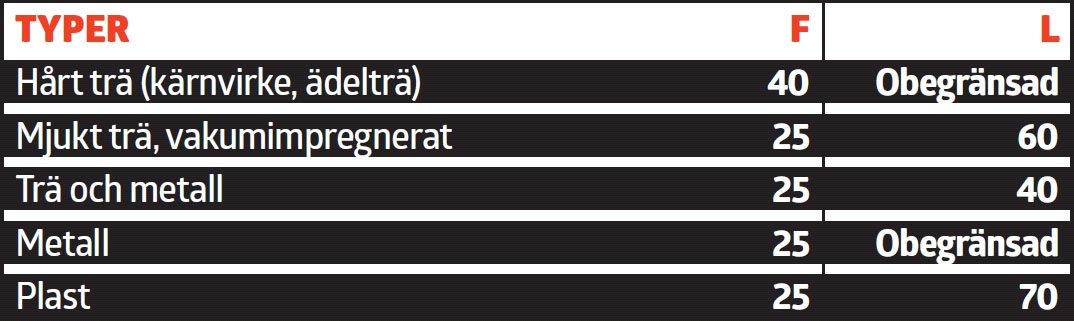 I Danmark har man däremot vågat sig på att ange hur lång livslängd en byggnadsdel har under förutsättning att man inte gör något. Vi har kikat lite på dessa informationer och har tagit fram några exempel. I våra tabeller betyder ett F försäkringsbolagens avskrivningstid (på utvalda ställen) och ett L betyder livslängd från dansk information.