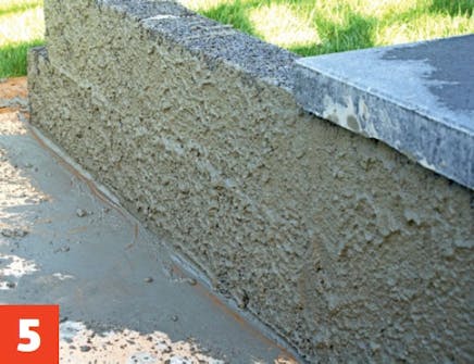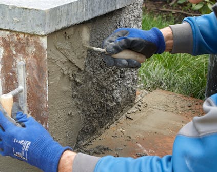 Muraren kastar bruket på sockeln: Ta bruk på en murslev och skicka den tunna cementblandningen i riktning mot sockeln med en knyck på handleden. Det kräver lite träning.