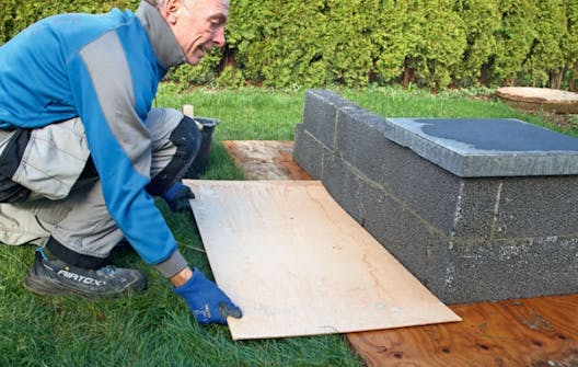 Du kan inte putsa utan att spilla. Det kan inte en murare heller. Se till att täcka ordentligt, så att det bruk som hamnar på andra ställen än på sockeln inte smutsar ner och lämnar fläckar på t ex marksten eller plattor. Använd en täckfilt eller som här en skiva, som kan följa med arbetet runt sockeln. Då är det lätt att samla ihop det bruk som hamnat fel, så att det kan återanvändas.