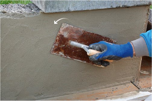 Börja med att täppa igen ordentligt under kanten mot fasaden, där det kan vara svårt att jämna ut bruket med putsbrädan. Då blir det helt tätt i övergången till fasaden.