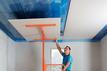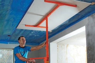 Om du har ett par medhjälpare kan ni sätta upp 120 cm breda gipsskivor i taket utan en skivlyft. Utan medhjälpare måste du ha en lyft. Du kan själv lägga en skiva på lyften och sedan styr du lyften så att den står rätt och hissar du upp skivan på plats. Medan lyften håller skivan skruvar du fast den.