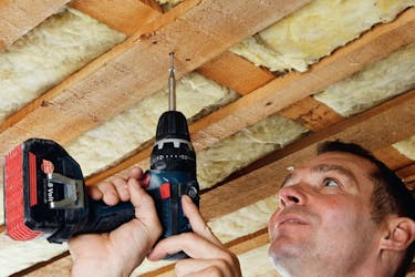 Skivan skruvas fast i glespanelen med 30 mm gipsskruvar för trä. Med en skruvdragare för bandskruv går arbetet synnerligen snabbt.