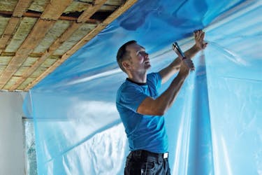 Den första våden sätts upp som en gardin tvärs över rummet. Skär först till folien så att den är 15 cm längre än rummet i varje ände. Fäst folien på var 30:e cm 240 cm från väggen. Då överlappar den 20 cm i taket och hänger ner 10 cm på väggen.