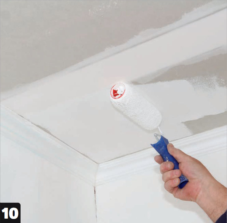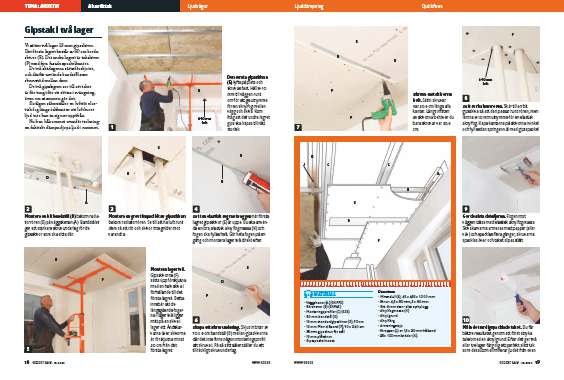 Gör de sista detaljerna. Fogen mot väggen tätas med elastisk akrylfogmassa. Skivskarvarna armeras med papper (eller väv) och spacklas flera gånger, skruvarna spacklas över och taket slipas slätt.