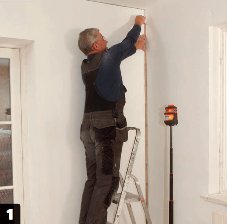 Markera undersidan av väggskenan (A) 3 cm över önskad takhöjd. Använd ett laservattenpass att mäta efter. Använd lasern för att ställa in rätt höjd i alla hörn och dra sedan streck mellan dem.