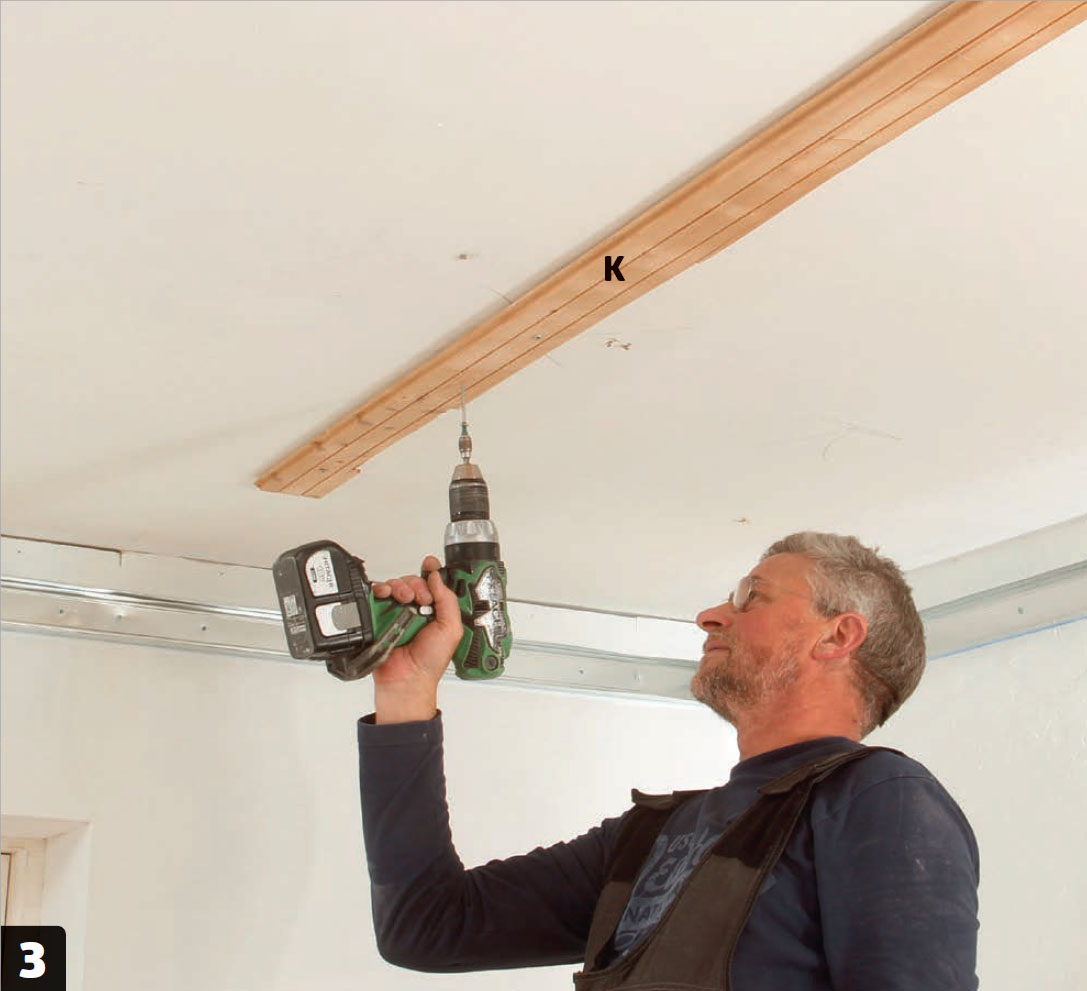 Gör ett skruvunderlag genom att skruva fast kraftiga brädor (K) i det gamla taket med 5 x 60 mm skruv. Underlaget säkerställer att resten av konstruktionen fäster i glespanelen under gipstaket. Under ett tak med panelbrädor eller gipsskivor skruvas brädor fast i bjälklaget, inte bara i panelbrädor eller gipsskivor.