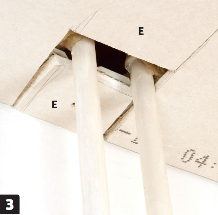Den första gipsskivan (E) lyfts på plats och skruvas fast. Håll 8-10 mm till väggen runt om för att ge utrymme för en akrylfog mellan vägg och skiva. Kom ihåg att det undre lagret gips ska kapas till rätt storlek.