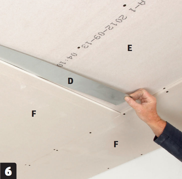 Vi sätter två lager 13 mm gipsskivor. Det första lagret består av 90 cm breda skivor (E). Det andra lagret är takskivor (F) med fyra fasade spackelkanter.