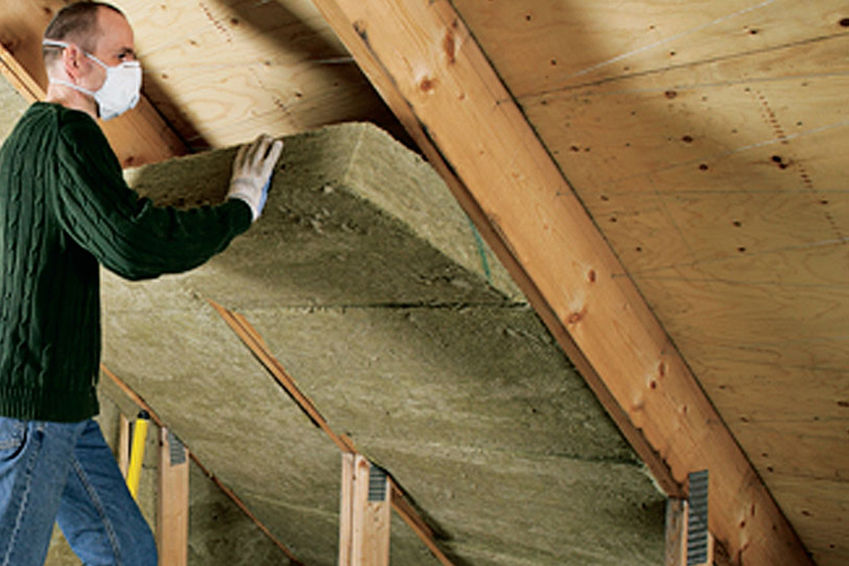 Isoleringen får inte ligga an mot underlagstaket eftersom det då kan bildas kondens på undersidan av taket. Det ska finnas en luftspalt på minst 50 mm mellan isolering och tak. Den åstadkommer du med hjälp av t.ex. ståltråd (som vi visar) eller genom att fästa lister på takstolarna som håller ut isoleringen från underlagstaket. De första 190 mm isolering klarar vi genom att först lägga en 145 mm skiva mellan takstolarna. Utanpå den läggs en 45 mm skiva.