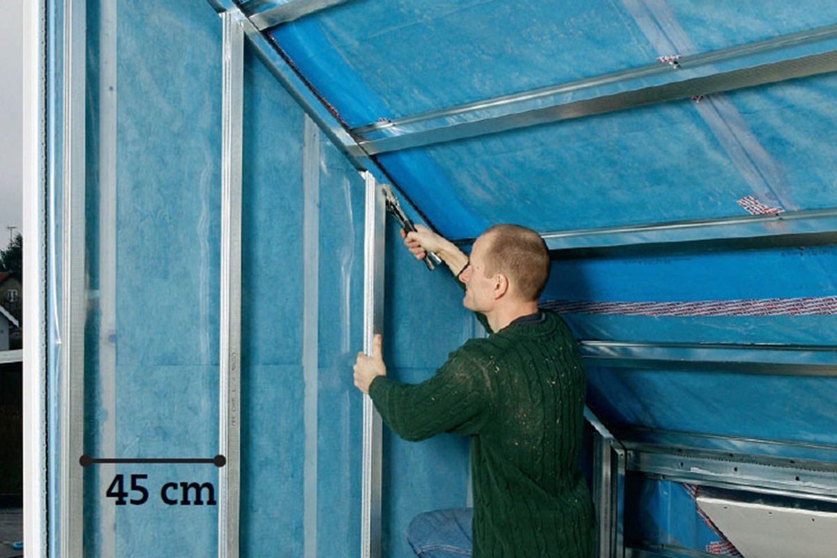 Stålprofilerna fästs liggande på takstolarna med 45 cm c/c-avstånd. Markera för placeringen med tusch och fäst profilerna med självborrande skruvar (då slipper du förborra).