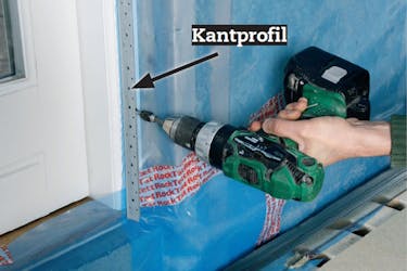 Runt dörrar och fönster monterar du kantprofiler på karmträet både längs sidorna och upp- och nertill. Ångspärren kläms fast mellan karm och profil.