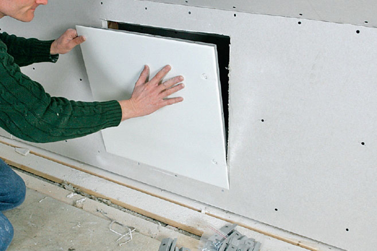Man ska aldrig stänga igen helt till en krypvind när det finns rör eller kablar där. Lösningen kan då vara en inspektionslucka, så att man kan sticka in huvudet och en ficklampa för att se att allt står rätt till eller lokalisera en skada. Vi monterar en isolerad inspektionslucka på 50 x 50 cm, som vi köpte klar för montering. Det är enklare än att snickra en egen, isolerad lucka.
