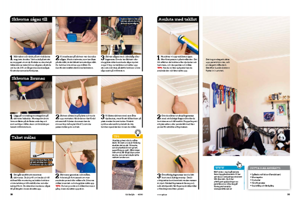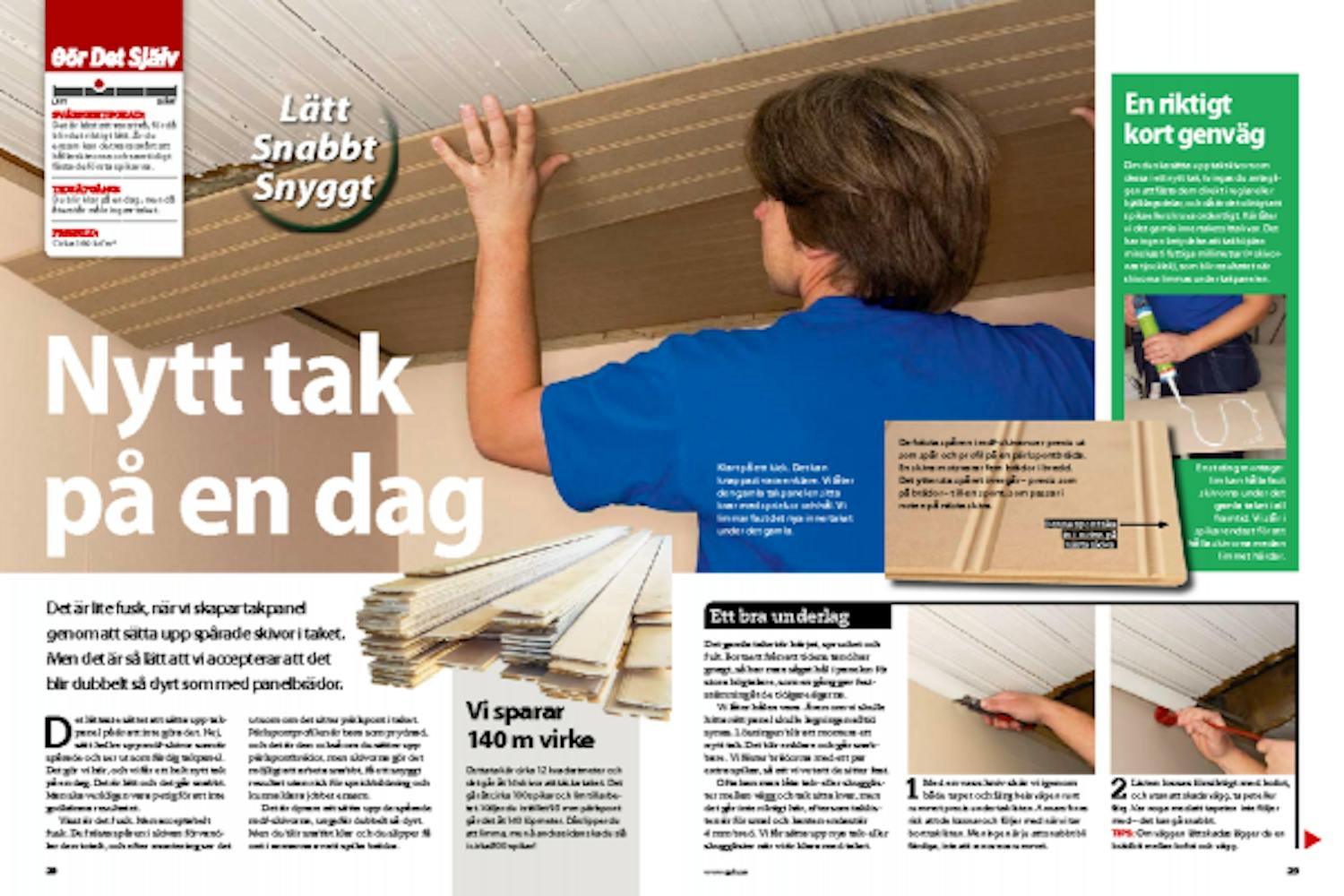 Mät taket och tänk på att vinklarna nog inte är räta. Tänk också på att det ser snyggast ut om du fördelar ev. skevhet på båda sidor av taket. Gör en sågplan, så att du vet hur de 235 cm långa skivorna ska sågas för att skarvarna ska förskjutas.