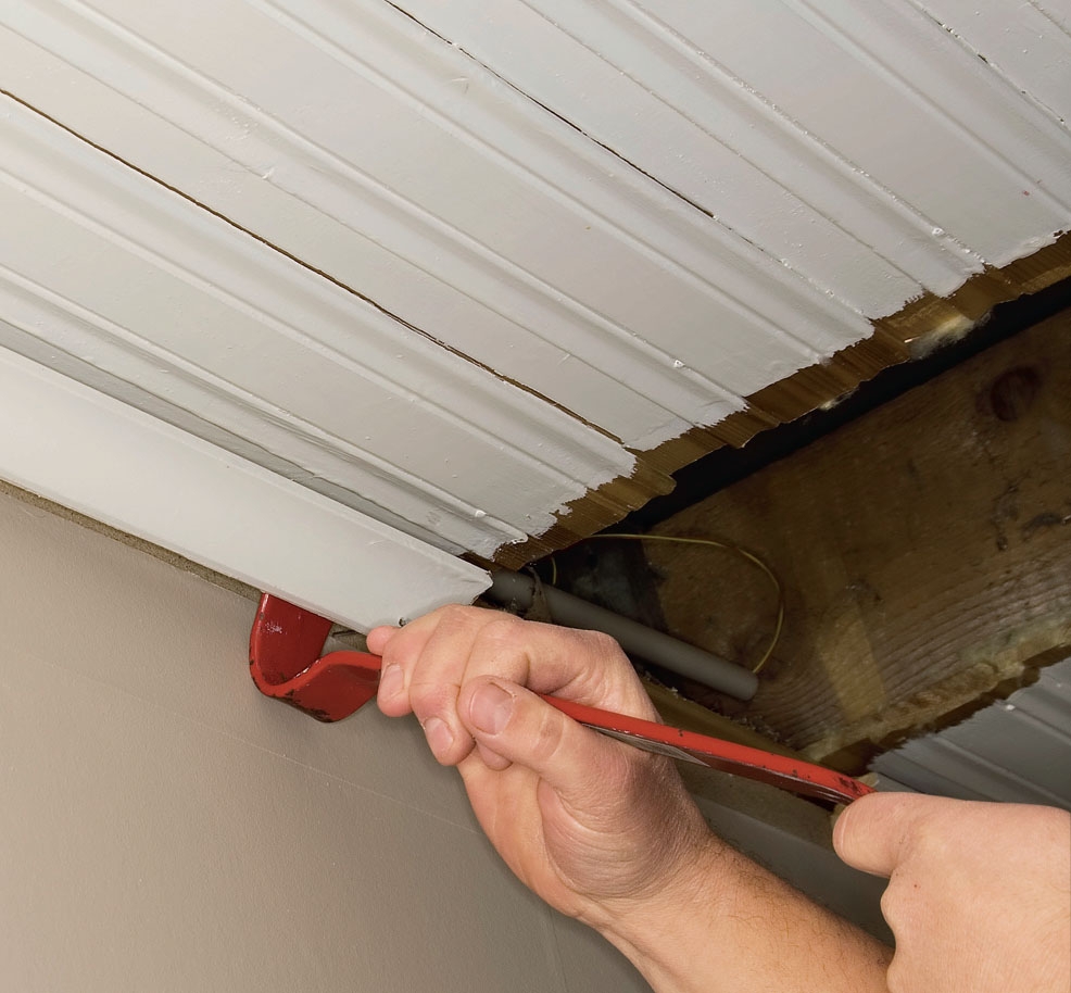 Det gamla taket är härjat, sprucket och fult. Bortsett från att tidens tand har gnagt, så har man sågat hål i panelen för stora högtalare, som en gång gav feststämning åt de tidigare ägarna.