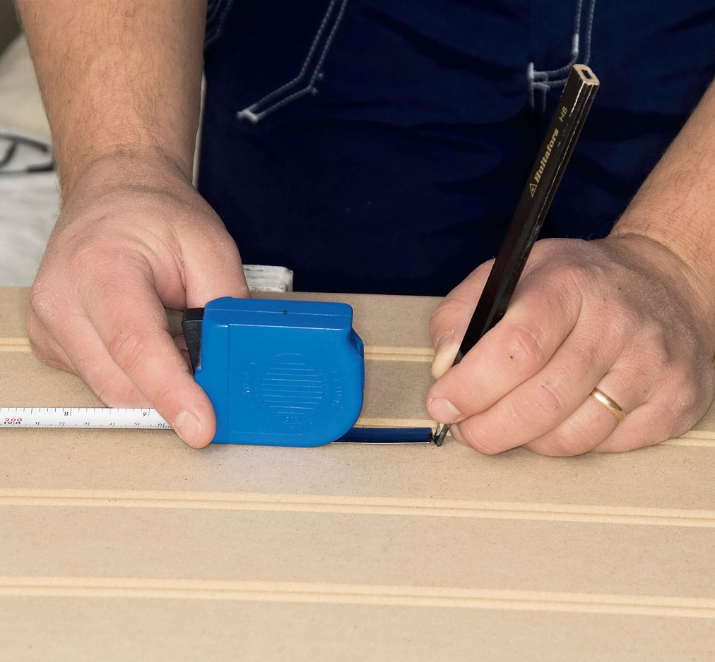 Vi markerar på skivan var den ska sågas. Med en talmeter, som kan låsas på alla mått, är det lätt att ta invändiga mått. Du behöver inte skriva upp måttet. Du överför det i stället direkt med talmetern.