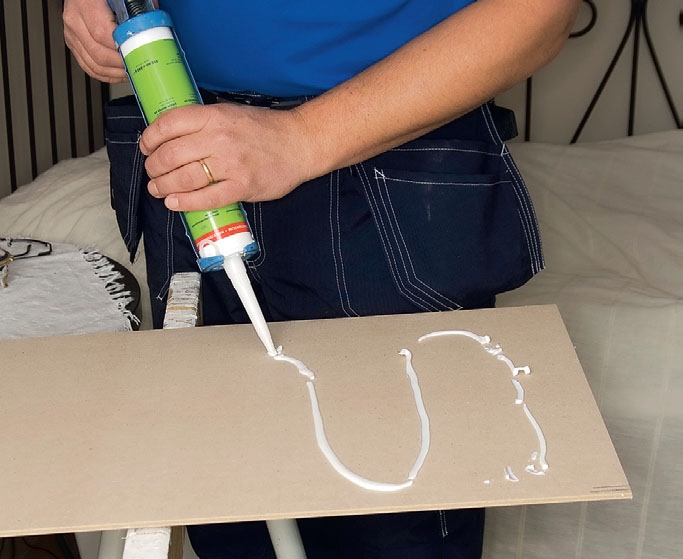 Lägg på en sträng montagelim på skivans baksida. Montagelim är ett lim som fäster på de flesta underlag och som verkligen håller, även om limsträngen bara är millimetertunn.