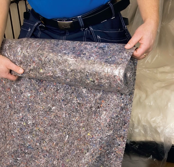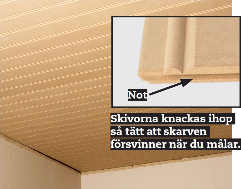 Skivan riktas in på plats och trycks upp mot taket. Här är det en klar fördel att vara två! Arbetar du ensam kan du skruva ihop två reglar till ett T, som ska passa mellan golv och tak.