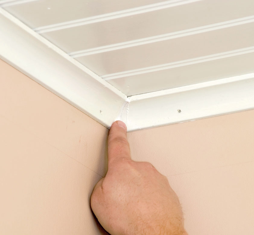 Ofta kan man låta tak- eller skugglister mellan vägg och tak sitta kvar, men det går inte riktigt här, eftersom taklisten är för smal och kanten endast är 4 mm bred. Vi får sätta upp nya tak- eller skugglister när vi är klara med taket.