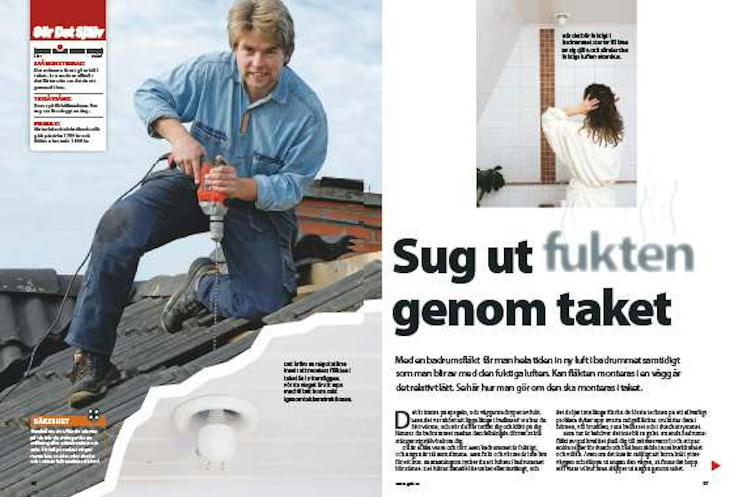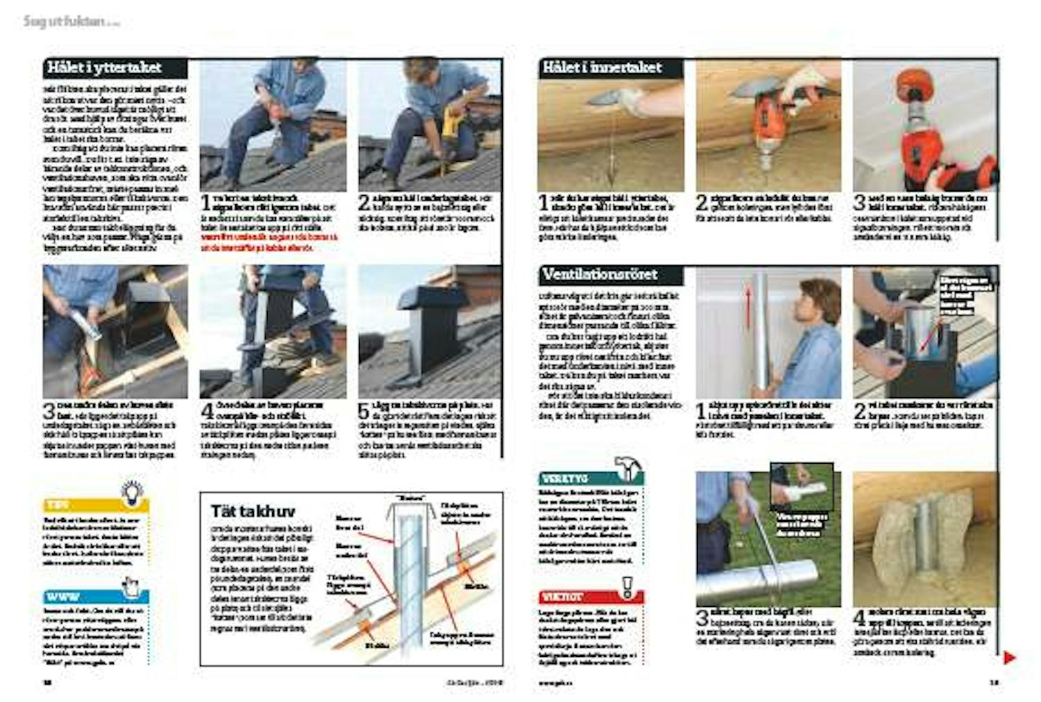 Kom ihåg att du inte kan placera rören som du vill. Du får t.ex. inte såga av bärande delar av takkonstruktionen, och ventilationshuven, som ska sitta ovanför ventilationsröret, måste passas in mellan tegelpannorna eller takskivorna. Den huv som används här passar precis i storlek till en takskiva.