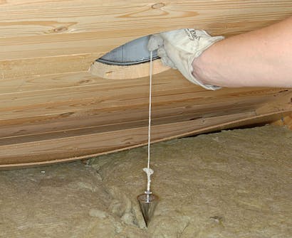 När du har sågat hål i yttertaket, ska du göra hål i innertaket. Det är viktigt att hålet hamnar precis under det övre. Här har du hjälp av ett lod som kan göra märke i isoleringen.