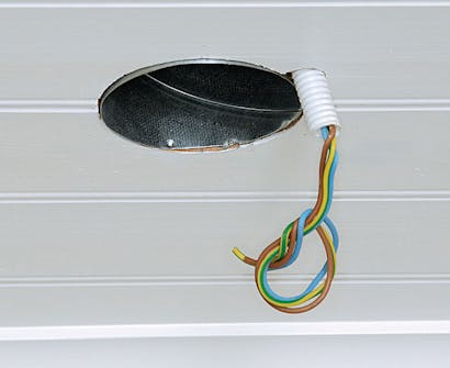 Be elektrikern dra fram ström till fläkten. Om sladdarna leds ut så tätt intill röret som här, så ser man dem inte när fläkten har monterats.