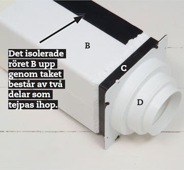 Fäst övergången C på det isolerade röret B genom att pressa ner den över röret. Klicka sedan fast skarvdelen D för den runda slangen. Skarvarna tätas med specialtejp för ventilationsrör.