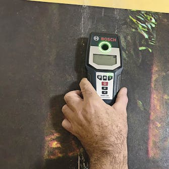 Börja med att kolla väggen med en scanner. Du vill inte borra i elkablar eller vattenrör. Undersök ett område runt omkring där du ska borra.